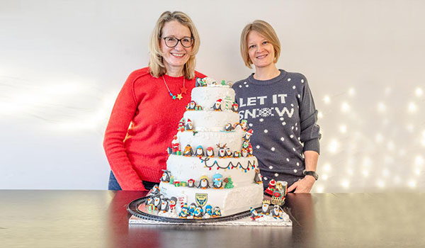This is our 9th year of donating a giant Christmas cake to The Oxford Christmas Lunch held on Christmas Day and providing a free lunch to 600. This year we baked a penguin party with loads of handmade icing models made by Dawn